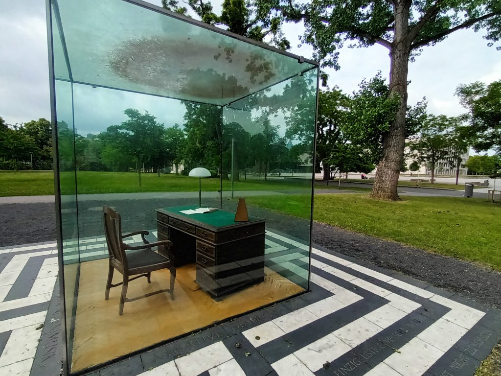 On Theodor W. Adorno Platz , named in honour of one of the founders of the Frankfurt School, there is a desk, a chair, a lamp and other objects placed on the desk, all under a glass dome. This work by Russian artist Vadim Zakharov was unveiled in 2003 to mark the 100th anniversary of the thinker’s birth.