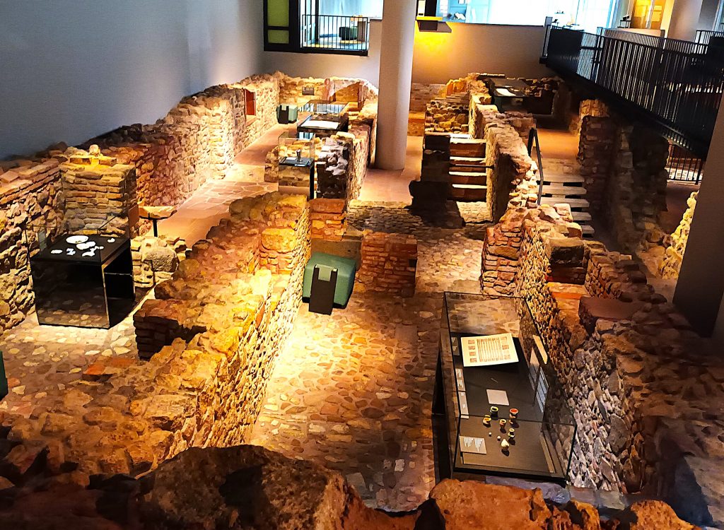 Le musée est sur 2 niveaux. Celui d’en dessous accueille les fondations d’anciennes bâtisses (maisons, puit, mikvé…) du ghetto et les raisons fondatrices de ce musée. Des petits livres posés à côté des sièges expliquent la vie des juifs d’antan, ainsi que certains rites, comme par exemple la préparation des matzots. Parmi les objets présentés à ce niveau, certains retrouvés lors des travaux d’aménagement du quartier, notamment un coussin de circoncision datant du 18e siècle.